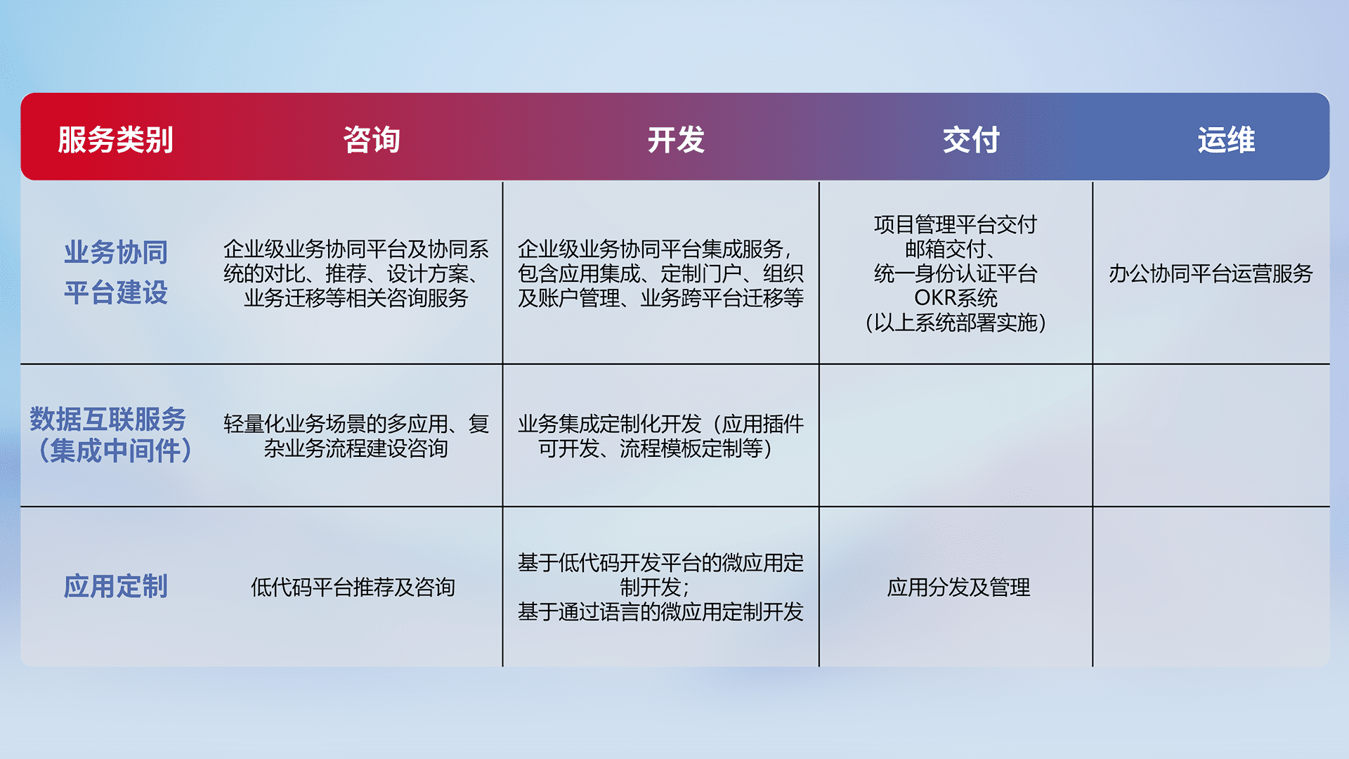 针对钉钉、、企微、、、、IDaas等平台级产品提供产品的规划、、方案、、、、交付、、、、定制化开发等服务,,,实现如统一协同办公、、、智能客户服务、、、、混合会议管理、、、智能数据查询、、、、等业务场景,,,实现数字化转型。。